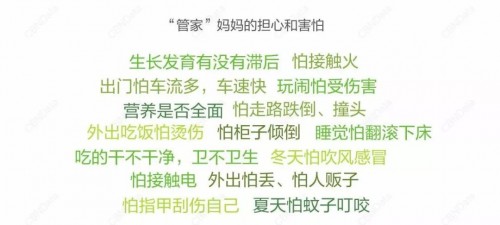 对于观察力细致入微的“管家”妈妈而言,“担心”和 “害怕”始终是贯穿她们育儿过程的重要关键词。正如CBNData《白皮书》显示,“吃的干不干净”、“营养是否全面”、“怕指甲刮伤自己”、“怕走路跌倒”、“撞头”等是“管家”妈妈尤其上心的安全隐患。